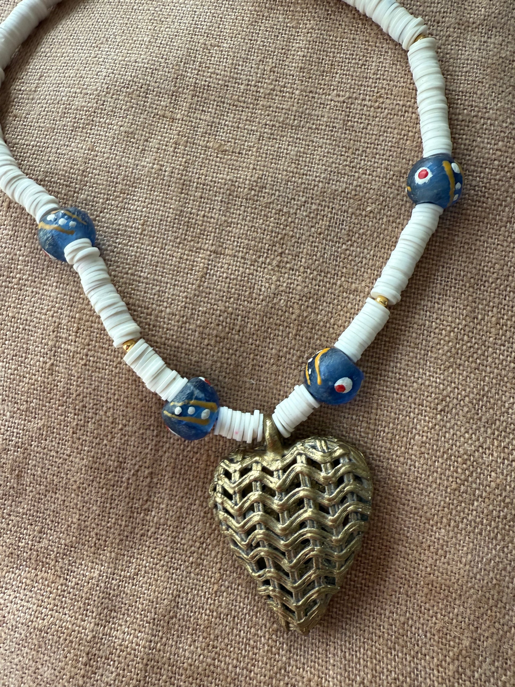 Collares de cuentas, vidrio pintado amano y pieza de bronce hecha a mano.